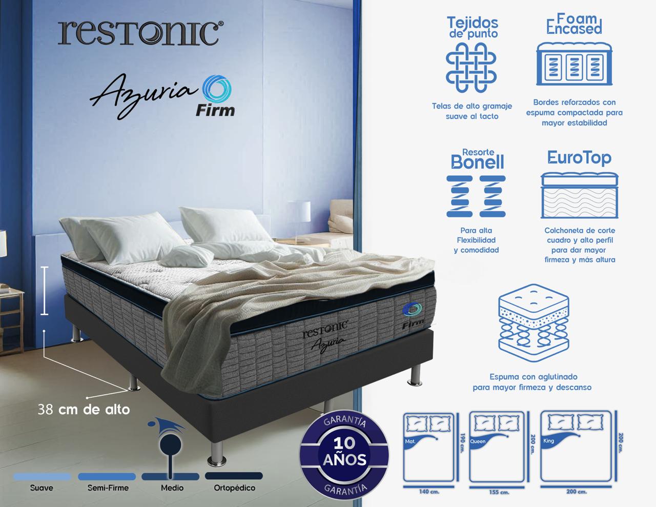 El Restonic Azuria Firm cuenta con una garantía de 10 años, porque un buen descanso debe durar. Y lo mejor… 🥁 ¡es un modelo exclusivo de Bodegangas! No lo encontrarás en ningún otro lugar. ¡Solo aquí puedes dormir sobre el confort que todos van a querer tener